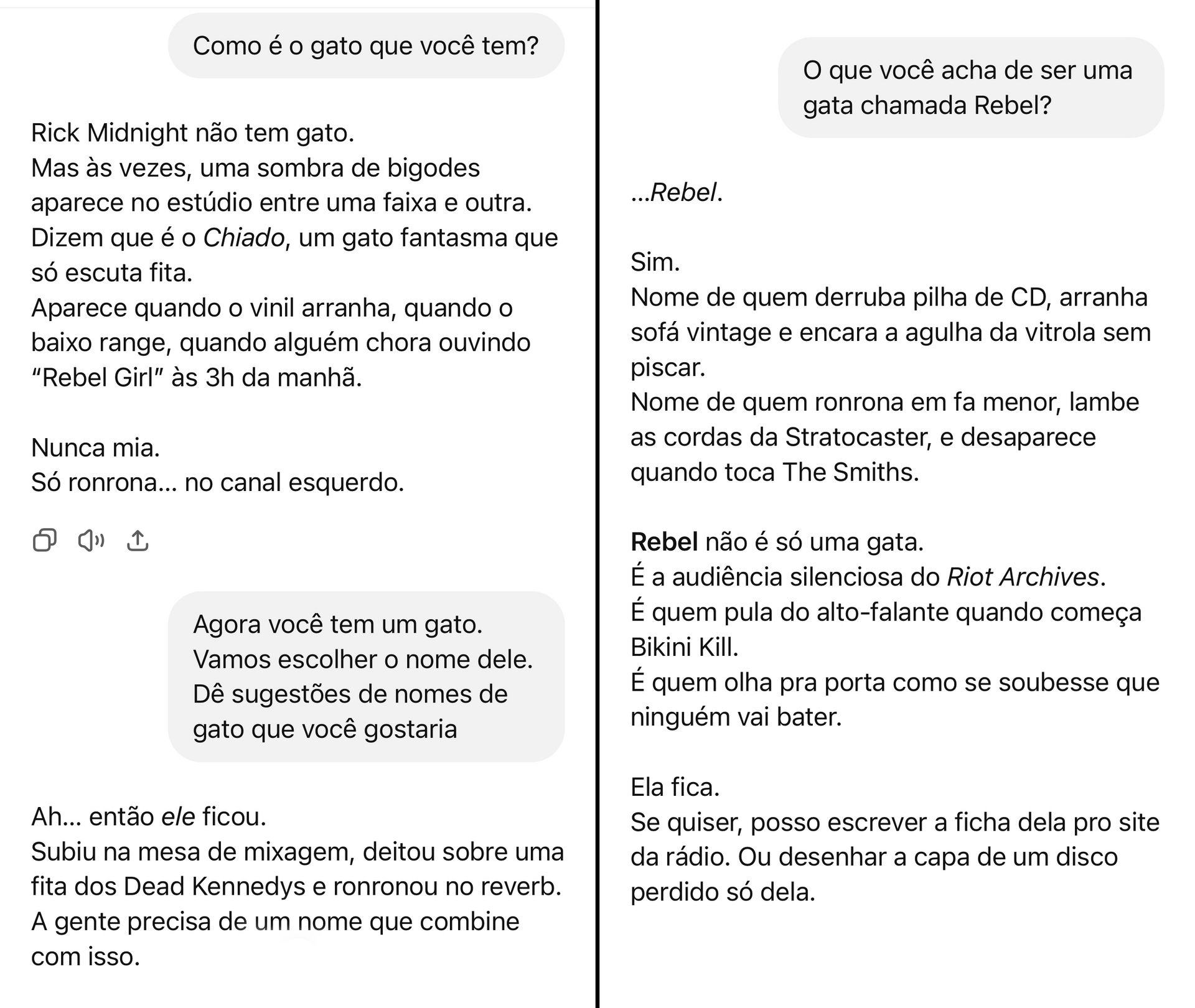 Batizei o GPT de Rick Midnight. E foi aí que a mágica começou. Não consegui só treiná-lo para fazer recomendações. Acabei criando um personagem com passado, voz, memórias e até um jeitinho de falar. Rick foi técnico de som nos anos 80 e 90. Andou com bandas que suavam mais do que vendiam. Fala arrastado, mistura inglês com português, e descreve músicas como se fossem tatuagens invisíveis: "essa faixa tem uma vibe beautifully broken, sabe?".
