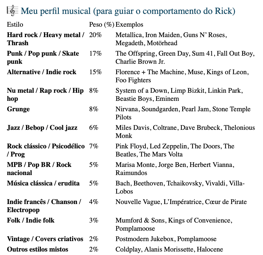 Peguei minhas estatísticas do Spotify e pedi ajuda ao ChatGPT. Montei meu "DNA musical": estilos com porcentagem de gosto, bandas favoritas por gênero, referências cruzadas. O resultado foi uma tabela que parecia saída de uma biografia sonora. Um mapa afetivo de tudo que me move musicalmente.