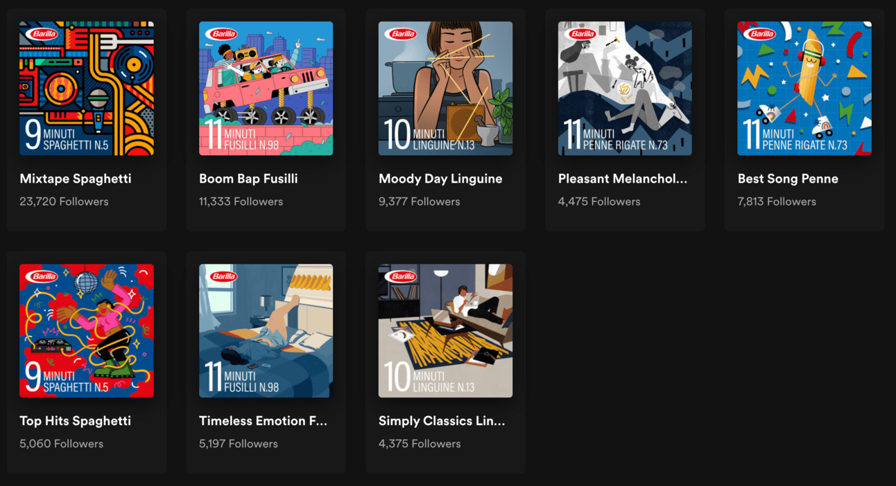 Das empresas que eu encontrei usando playlists no Spotify, a mais criativa foi a Barilla. E o mais surpreendente é ver uma marca de massas criando uma playlist que é realmente útil para quem compra os produtos da empresa.
