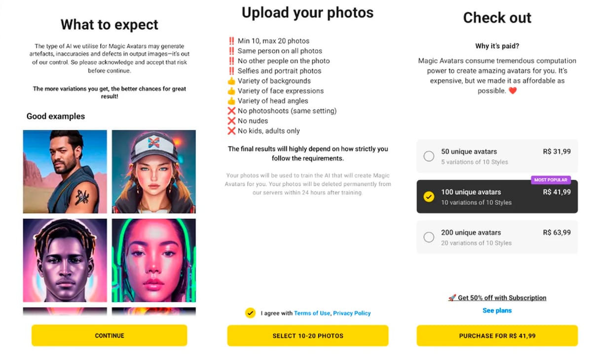 Um dos primeiros apps de AI a estourar com o grande público foi o Lensa. Que você subia suas fotos e ele usava a Inteligência Artificial para transformar em retratos temáticos. Foi em dezembro do ano passado, quando todo mundo estava postando foto de avatar de astronauta no Instagram e no LinkedIn.