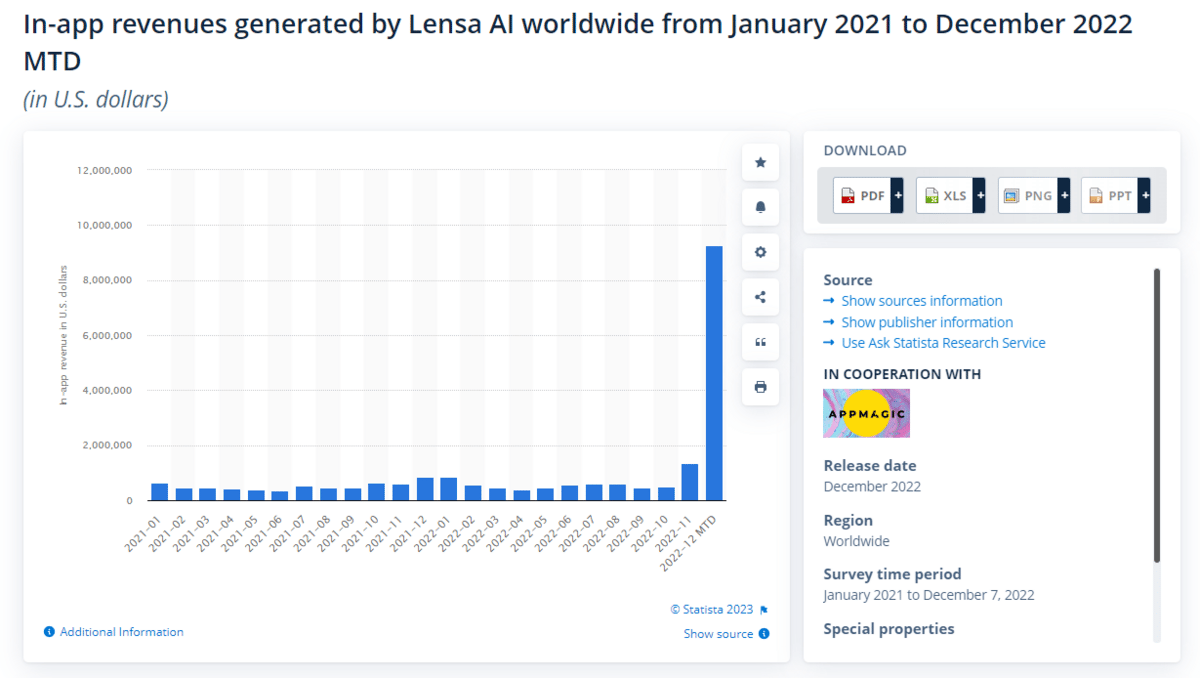 E isso aí era algo que já era possível fazer em outros seviços que ofereciam até amostras grátis, como o Midjourney e o DALL-E. Mas o Lensa era mais simples e focado. Uma promessa clara com uma entrega direta. Com isso eles conseguiram arrecadar quase U$ 10mi em dezembro. MUITO mais que nos meses anteriores.