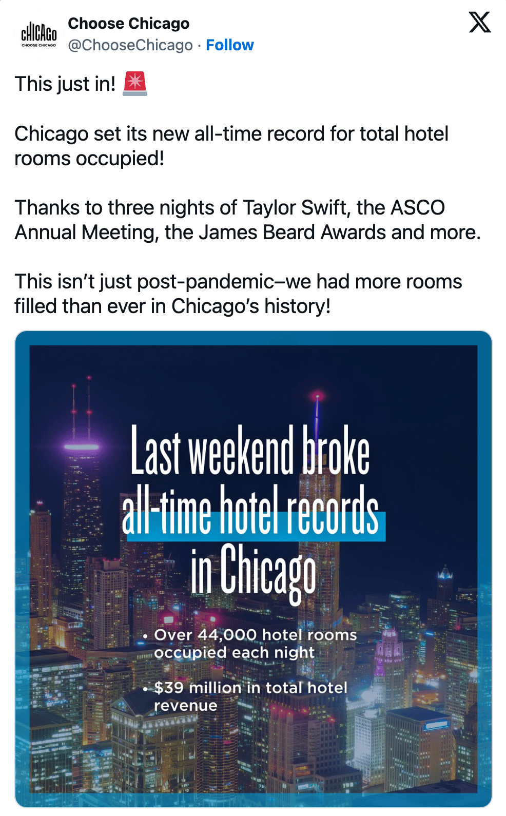 Por exemplo, Chicago bateu o recorde de reservas de hotéis no fim de semana da turnê. Gerando 39 milhões de dólares só com hospedagem.